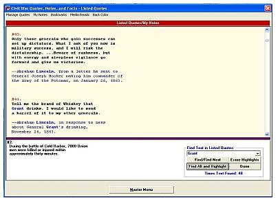 Shown in this screen shot is the dialog box of the Find feature. The Find feature is available in the Listed Quotes and the Listed Notes and Facts, it gives you a powerful way to search through the quotes (or notes and facts) to locate any words, phrases, names, places, or whatever you wish to find. Merlin the Civil War Reading Wizard is available to read the Listed Quotes.